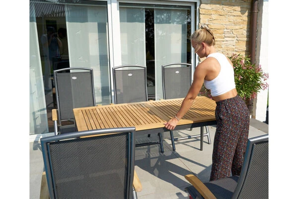 Der Hersteller setzt dabei, neben dem minimalistischen Design, vor allem auf besonders hochwertige Materialien. Diese sind dabei ebenso robust wie edel. Das beginnt schon beim stabilen Rahmen: Durch den Einsatz von Aluminium kann nicht nur die Optik überzeugen, sondern auch die hohe Robustheit. Der Gartentisch bietet mit seinen Maßen von ca. 160/220 x 90 cm bei einer Höhe von ca. 74 cm ausreichend Platz um gemeinsam schöne Stunden bei einem Brunch im Garten zu verbringen. Die Tischplatte besteht aus Teakholz und lässt sich durch einen geschmeidigen Butterfly-Auszug problemlos von ca. 160 cm auf ca. 220 cm verlängern, sodass Sie zahlreiche Plätze für Gäste schaffen. Die hochwertige Materialauswahl und die sorgfältige Verarbeitung sorgen nicht nur für die exklusive Optik dieses Ausziehtisches, sondern machen den Tisch auch sehr stabil. Genießen Sie mit gutem Gewissen entspannte Stunden im Garten