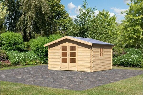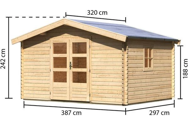 Das Blockbohlenhaus Meldorf 5 aus nordischer Fichte von KARIBU wird aus 38 mm Wandbohlen in klassischer Blockbohlenbauweise gefertigt und kann somit rasch und einfach aufgebaut werden. Bei der Blockbohlenbauweise werden die Wandbohlen reihum montiert. Begonnen wird mit einer halben, sprich unten glatten Bohle. Die patentierte 6-Plus-Eckverbindung sorgt dabei für höchste Wind- und Regendichtigkeit. Die Schraublöcher in den Blockbohlen sind werkseitig vorgefertigt und vereinfachen den Aufbau enorm. Das praktische Satteldach sorgt dafür, dass das Gartenhaus schnell und wirkungsvoll gegen Witterungseinflüsse geschützt ist. Zudem ist es optisch eine Augenweide. Der vordere Dachüberstand ist ausreichend groß dimensioniert, um den Eingangsbereich wirkungsvoll zu schützen. Das Haus hat eine Grundfläche von ca. 11,5 m² und ca. 22,2 m³ umbauten Raum. Dank der Seitenhöhe von ca. 188 cm und einer Firsthöhe von ca. 242 cm sorgt das Haus innen für viel Platz. Kesseldruckimprägnierte Bodenbalken sorgen für optimalen Schutz gegen aufsteigende Feuchtigkeit. Durch die Positionierung unter dem Gartenhaus schützen die Bodenbalken effektiv vor Staunässe und Spritzwasser. Das Gartenhaus wird mit einer Doppelflügeltür aus Kunstglas im stabilen Massivholzrahmen ausgeliefert und bietet dank der großen Öffnung bequemen Zutritt in das Haus. Nebenbei bietet sie effektiven Schutz vor Diebstahl und ist mit einem Buntbartschloss mit zwei Schlüsseln ausgestattet. Gleichzeitig lassen die großzügigen Lichtausschnitte im jeweiligen Türflügel ausreichend Tageslicht in das Gartenhaus einströmen.