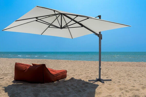 Der quadratische Sonnenschirm von OUTFLEXX® besticht durch seine hochwertig verarbeiteten Materialien und seine praktischen Funktionen. Das ca. 350 x 350 cm große Schirmtuch besteht aus 100% Polyester (ca. 250 g/m²). Zusätzlich ist das cremefarbene Schirmtuch wasserabweisend imprägniert. Das Gestell besteht aus pulverbeschichtetem Aluminium in anthrazit und hat dabei eine Haupt-Rohrdicke von ca. 65 x 95 mm. Der Ampelschirm besitzt keinen Mittelmast und bietet daher eine praktische Lösung, um ohne Probleme eine komplette Sitzgruppe zu beschatten. Die großzügige Durchgangshöhe von ca. 210 cm schränkt die Nutzung Ihrer Terrasse in keinster Weise ein. Durch einen hohen UV-Schutz von 80+ spendet der Sonnenschirm dabei extra viel Schatten. Die Beschattung bei unterschiedlicher Sonneneinstrahlung ist mit diesem praktischen Ampelschirm problemlos möglich, da das Schirmtuch entlang des Standrohres und des Stützbalkens geneigt werden kann. Zudem lässt sich der Schirm durch den leichtgängigen Kurbelmechanismus kinderleicht aufspannen. Diese Kurbel können Sie in den unteren Teil des Schirmstocks umstecken und so den Schirm um 360° drehen. Das integrierte Air-Vent System lässt auch bei sehr warmen Klima die Luft unter dem Schirmtuch zirkulieren. Die 8 eingebauten Dachstreben mit den Maßen von ca. 17 x 25 mm sorgen zusätzlich für weitere Standfestigkeit. Im Lieferumfang ist ein Plattenständer für Wegplatten enthalten. Um einen sicheren Stand zu gewährleisten, empfehlen wir Ihnen den ca. 29 kg schweren Ampelschirm mit ca. 200 kg Wegplatten zu beschweren. Bitte beachten Sie, dass die Platten NICHT mit im Lieferumfang enthalten sind.