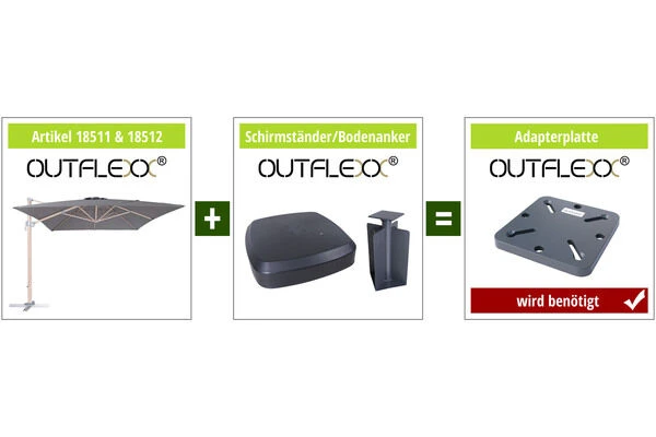 Wichtige Information: Dieser Schirm kann ohne Adapterplatte mit unseren OUTFLEXX® Schirmständern oder dem OUTFLEXX® Bodenanker kombiniert werden.