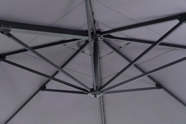 Das Gestell und die Streben bestehen aus pulverbeschichtetem Aluminium in der Farbe anthrazit. Aluminium eignet sich besonders gut als Material für das Gestell von Sonnenschirmen, da es ein sehr leichtes Material ist. Gleichzeitig ist es sehr stabil, witterungsbeständig und besitzt eine lange Lebensdauer. Durch die Pulverbeschichtung wird die bereits vorhandene Korrosionsbeständigkeit sowie die Stoß-, Schlag- und Kratzfestigkeit nochmals verbessert. Der Schirm hat eine Gesamthöhe von ca. 310 cm und besitzt ein ovales Hauptrohr mit einer Dicke von ca. 100 x 140 mm und einer Materialstärke von ca. 3,2 mm. Damit unterstreicht das Schirmgestell nochmals seine Stabilität und das Nettogewicht des Schirms von ca. 55,5 kg stellt keine Last dar.