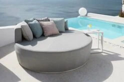 Das Untergestell des Möbelstücks besteht aus pulverbeschichtetem Aluminium, dies macht es nicht nur stabil, sondern sorgt auch dafür, dass es sich aufgrund des relativ geringen Gewichts ganz leicht hin und her stellen lässt. Das Aluminiumgestell wird mit Polyrattangeflecht bespannt. Das doppel-halbrunde Geflecht ist in der Farbe champagner-meliert gehalten und passt so wunderbar zu allen möglichen Terrasseneinrichtungen.