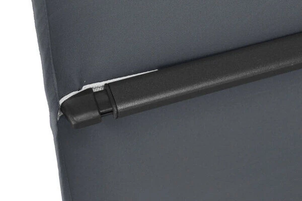 Der Ampelschirm Sunset N+ ohne Volant lässt durch seinen seitlich stehenden Mast viel Platz für Ihre Stühle und Tische. Das anthrazitfarbene Schirmtuch des Sonnenschirms ist ca. 300 x 300 cm groß und der Schirm ist ca. 190 cm hoch. Durch den 360° drehbaren Mast sowie die Neigungs- und Kippfunktion lässt sich der Schirm perfekt dem Sonnenstand anpassen und spendet immer den gewünschten Schatten. Der hochwertige Schirmstoff aus 100 % Polyester (ca. 300 g/m²) bieten einen exzellenten UV-Schutz und einen Lichtschutzfaktor von UPF 50+. Zudem kann der Bezug abgenommen und per Hand gewaschen werden. Der stabile Aluminiummast ist in Anthrazit pulverbeschichtet und damit höchst witterungsbeständig. Acht genietete Streben (ca. 14 x 24 cm) aus Aluminium sorgen für die nötige Stabilität und Flexibilität. Der einteilige, ovale Unterstock misst ca. 53 x 80 cm. Zum bequemen Öffnen und Schließen des Schirms kommt die handliche Kurbel zum Einsatz. Das Windventil am oberen Ende des Sonnenschirms verhindert das Umfallen bei starken Windböen.